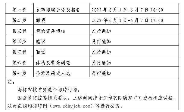 2022年6月1日至2022年6月7日16:00 在鴻雅招聘網(wǎng)(http://www.cdhyjob.com/)、鴻雅微信公眾號、國控集團(tuán)官方網(wǎng)站(http://www.jskzz.cn/)及上級部門要求的相關(guān)網(wǎng)站等發(fā)布招聘公告。